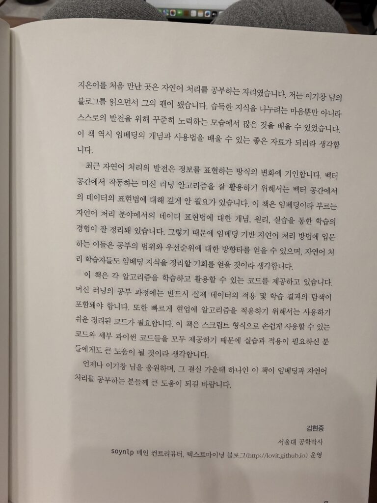 사실 학원에서 초반에 Bow와 n-gram 을 배우는데 까맣게 있고 있다가 책으로 다시 접하니 반가웠다. 전엔 하나도 이해가 가지 않던 하이퍼볼릭탄젠트와 소프트맥스로 출력과 출력을 거치는데 무슨 말이지 하며 눈물이 날뻔 했던 부분이 좀더 이해가 가능해졌다. 물론 인공지능의 도움도 조금 빌렸지만.